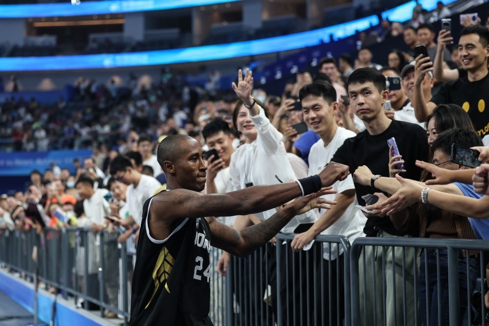 9月28日,約旦隊球員倫達·杰斐遜籃球男子預(yù)賽C組后與觀眾互動。