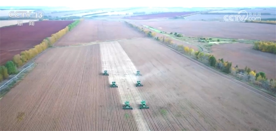 您現(xiàn)在看到的是黑龍江墾區(qū)鶴山農(nóng)場的大豆“高產(chǎn)攻關(guān)”示范田,眼下正是大豆收獲的高產(chǎn)期,農(nóng)場每天出動(dòng)52臺(tái)收獲機(jī),節(jié)糧減損,確保豐收的糧食顆粒歸倉。