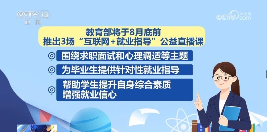 據(jù)了解,教育部將于8月底前推出3場(chǎng)“互聯(lián)網(wǎng)+就業(yè)指導(dǎo)”公益直播課,圍繞求職面試和心理調(diào)適等主題,為畢業(yè)生提供針對(duì)性就業(yè)指導(dǎo),幫助學(xué)生提升自身綜合素質(zhì)、增強(qiáng)就業(yè)信心。