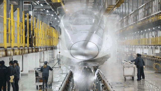 在外“奔波”了一整天的高鐵動車組回到動車所后,首先會沿著鋼軌來到洗車房“洗個澡”。當動車通過洗車房時,“機洗房”便自動開啟智能工作模式。列車以3至5公里的時速開過“澡堂”時,數(shù)十個“花灑”噴嘴會給車身預濕,之后的噴嘴噴灑專用“沐浴露”,斜刷、側(cè)刷、底刷快速投入工作。