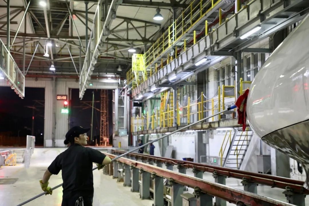 動車組經(jīng)過洗車機時,調(diào)度室內(nèi)調(diào)度員精準聯(lián)控司機,機房有專業(yè)的設(shè)備操作人員負責監(jiān)控,確保洗車機正常運轉(zhuǎn),外皮清洗到位。在動車檢修庫內(nèi),質(zhì)檢員全方位卡控人工清洗環(huán)節(jié),檢查清潔是否到位。