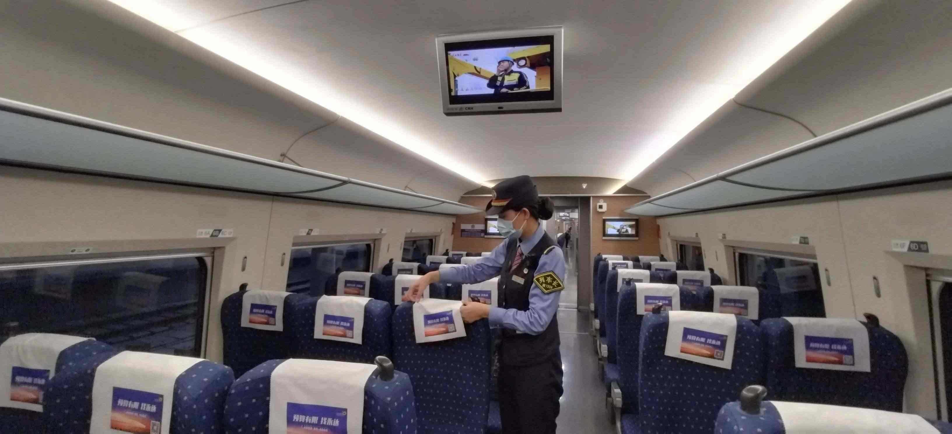 除了車身硬件的“美妝”,在列車上線始發(fā)前,列車乘務人員還要檢查各類客運服務備品、衛(wèi)生備品等是否準備齊全。他們需要保證車座椅背后網(wǎng)兜清潔袋擺放整齊,小桌板統(tǒng)一收起,頭枕巾和椅套擺放平整、干凈、無污染。