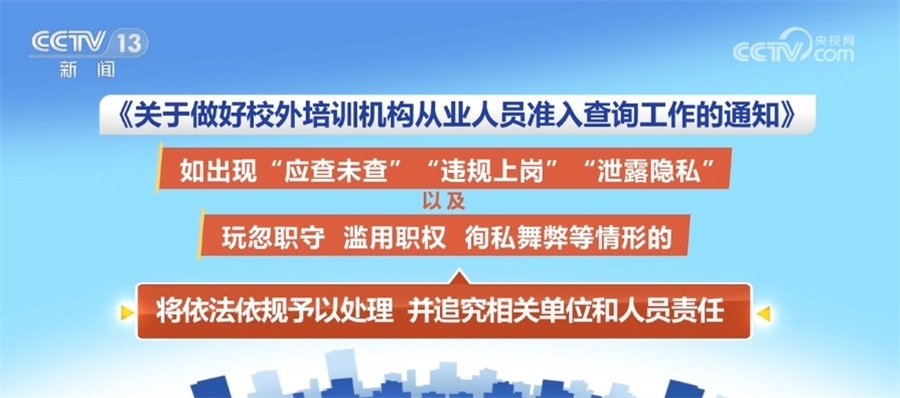 此外,《通知》強調(diào)嚴明查詢管理責任。各級教育部門和相關主管部門、校外培訓機構及其工作人員應履行準入查詢的法定職責,如出現(xiàn)“應查未查”“違規(guī)上崗”“泄露隱私”以及玩忽職守、濫用職權、徇私舞弊等情形的,將依法依規(guī)予以處理,并追究相關單位和人員責任。