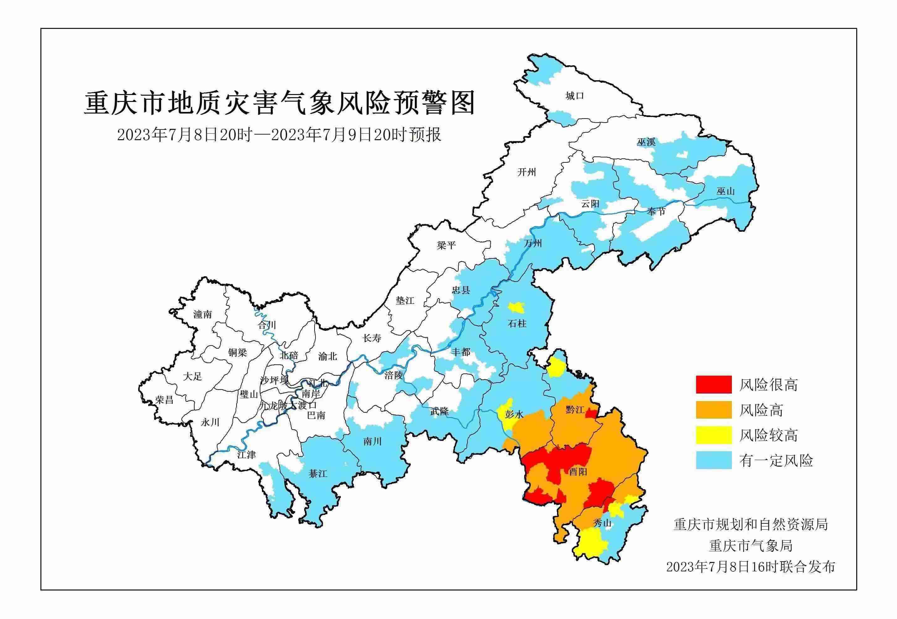 7月8日16時,重慶市規(guī)劃和自然資源局、重慶市氣象局聯(lián)合發(fā)布全市地質(zhì)災害氣象風險預警。