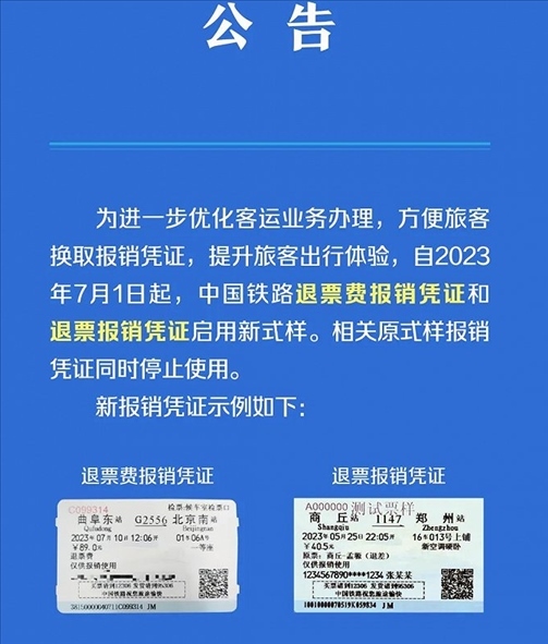 ·中國鐵路退票費報銷憑證和退票報銷憑證啟用新式樣。