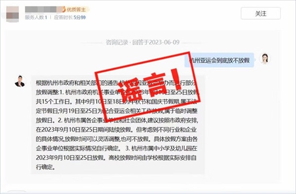 ·杭州因舉行亞運會9月10日到25日放假?官方辟謠。