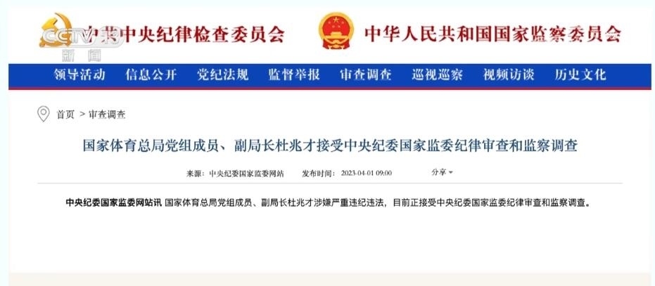 總臺央視記者 宋琎:今年3月27日,二十屆中央首輪巡視對象名單公布?!皩殷w育總局黨組開展機動巡視”這一消息迅速成為社會熱點。之后不到一周,中央紀委國家監(jiān)委通報,時任國家體育總局黨組成員、副局長杜兆才接受審查調(diào)查。體育領(lǐng)域反腐成為今年反腐敗工作的一大重點。