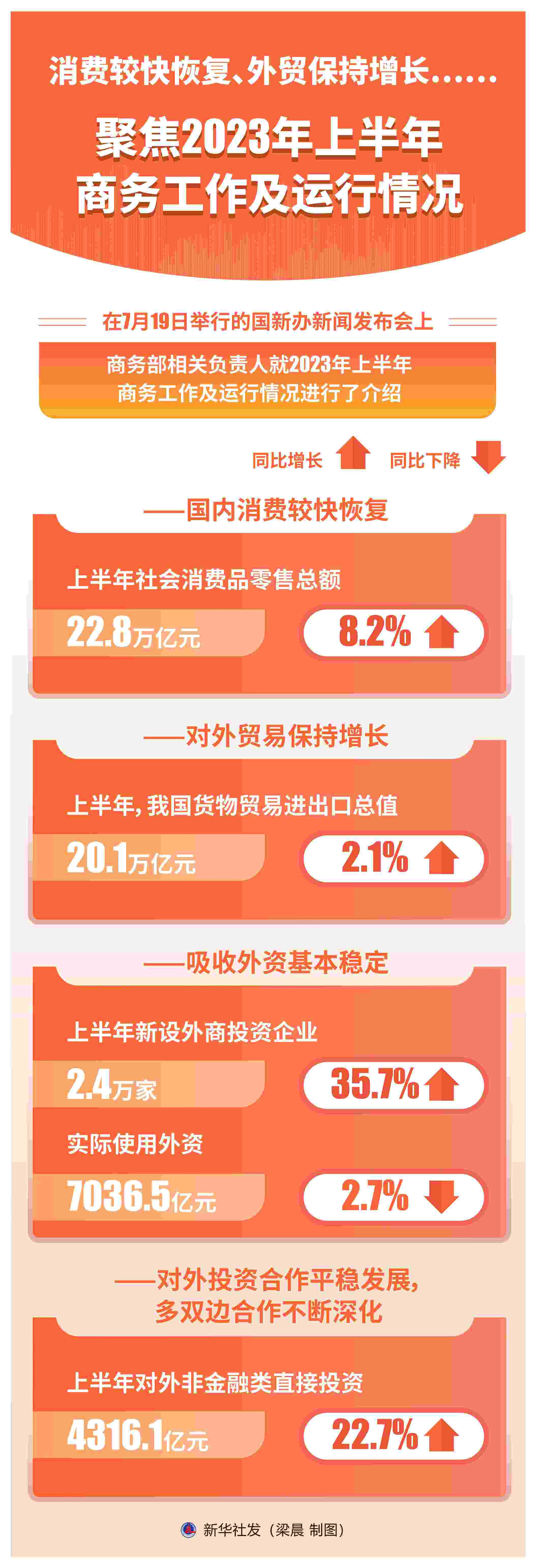 新華社北京7月19日電 題:消費較快恢復、外貿(mào)保持增長……聚焦2023年上半年商務工作及運行情況