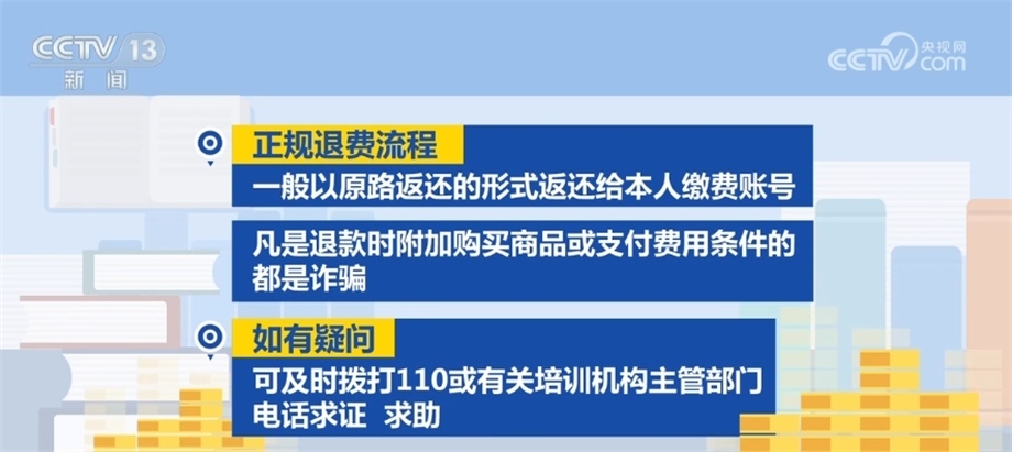 正規(guī)退費(fèi)流程一般以原路返還的形式返還給本人繳費(fèi)賬號,凡是退款時(shí)附加購買商品或支付費(fèi)用條件的都是詐騙。如有疑問,可及時(shí)撥打110或有關(guān)培訓(xùn)機(jī)構(gòu)主管部門電話求證、求助。