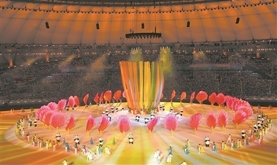 開幕式上,“太陽神鳥”穿越時空翩飛而至,4只神鳥圍繞旋轉(zhuǎn)的太陽飛翔。12道金色光芒漸次點亮,點亮了整個體育場。
