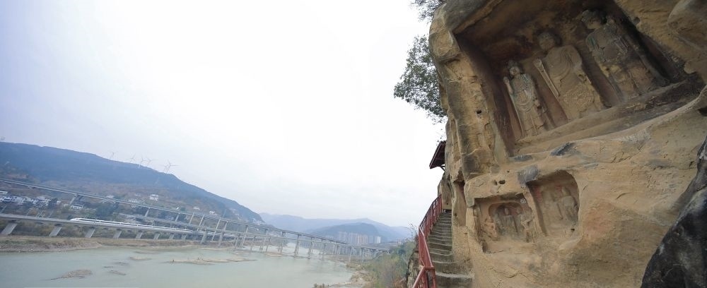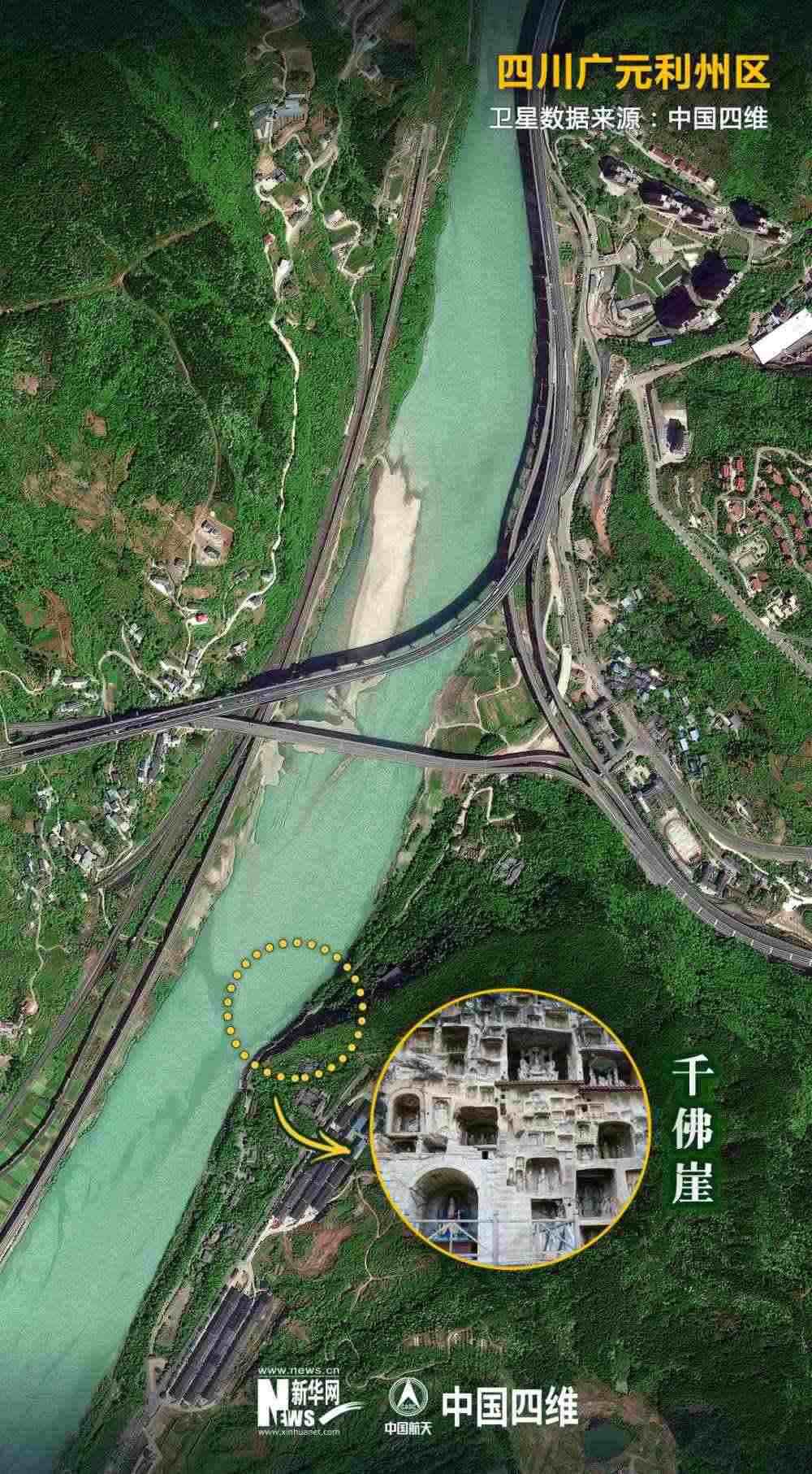 值得關(guān)注的是,就在千佛崖的河對岸,幾條現(xiàn)代化交通網(wǎng)錯落有致地交織在一起。今日的廣元是名副其實的“交通博物館”。老川陜路、京昆高速、寶成鐵路、西成高鐵、嘉陵江航道在這里交織“奔騰”。橫渡嘉陵江,仿佛穿越古今。