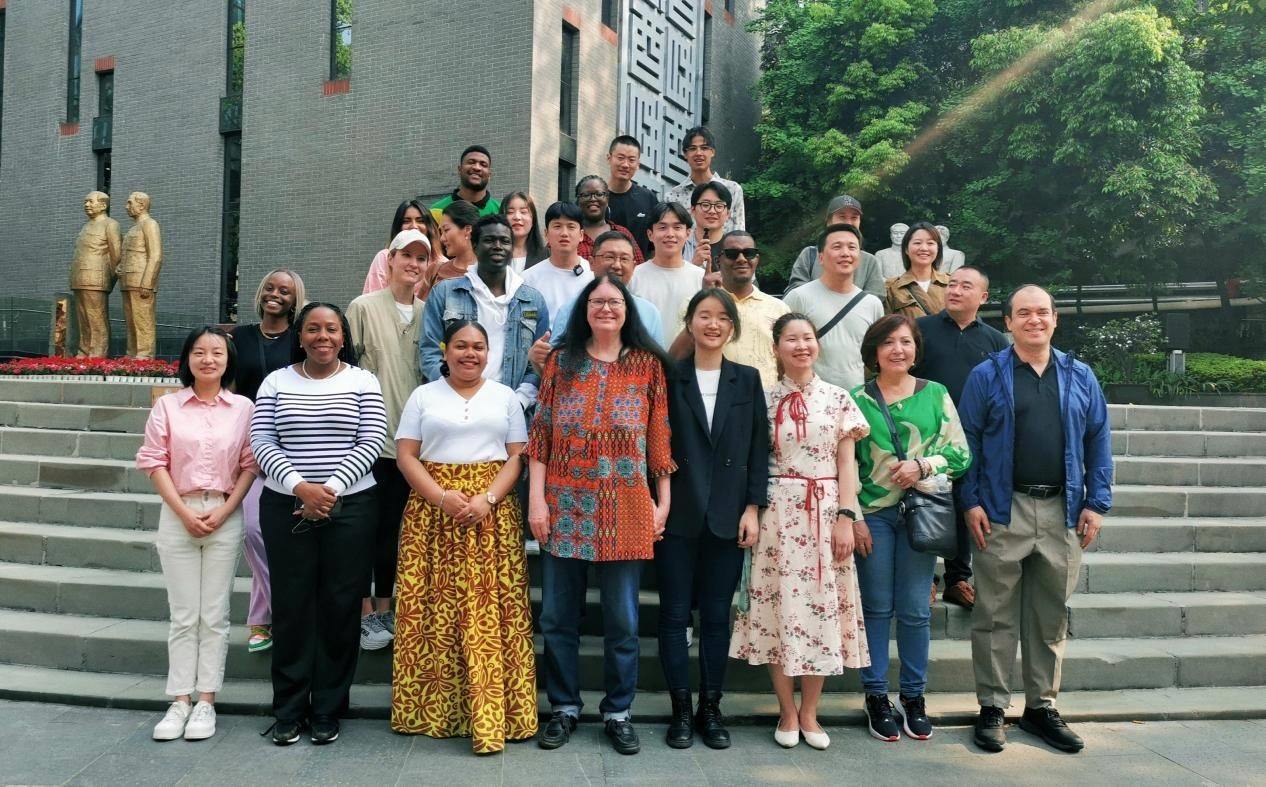 ↑7月29日,美國運動員杜恩(左)在聯(lián)歡會現(xiàn)場與川劇演員互動。新華社記者 蔡湘鑫 攝