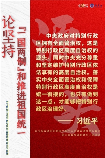 “一國兩制”是黨領(lǐng)導(dǎo)人民實(shí)現(xiàn)祖國和平統(tǒng)一的一項(xiàng)重要制度,是國家的一項(xiàng)基本國策。中國特色社會(huì)主義進(jìn)入了新時(shí)代,意味著“一國兩制”事業(yè)也進(jìn)入了新時(shí)代。不斷推進(jìn)“一國兩制”在香港、澳門的成功實(shí)踐,是中華民族偉大復(fù)興歷史進(jìn)程的重要組成部分。