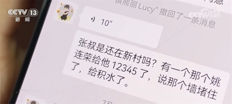 熊麗生前的微信語(yǔ)音:宗叔,是還在新村嗎?有一個(gè)姚連榮打12345了,說(shuō)那個(gè)墻堵住了,給積水了。
