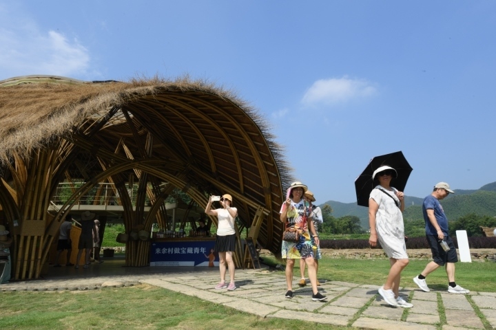 游客在安吉余村參觀用當(dāng)?shù)厥a(chǎn)的竹材料建造的建筑。圖片來(lái)源:新華社