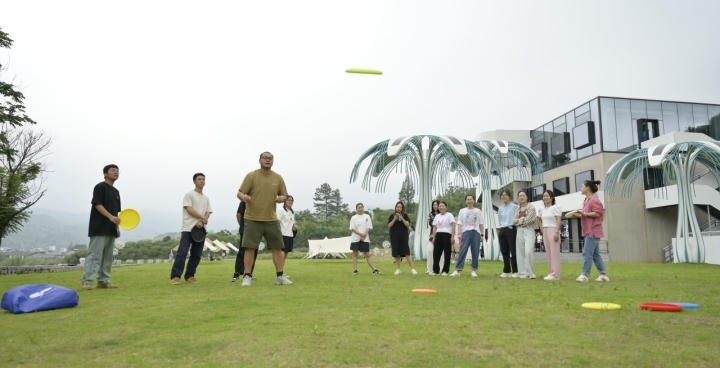 在安吉余村鄉(xiāng)村圖書(shū)館前,年輕人在草坪上玩飛盤(pán)。圖片來(lái)源:新華社