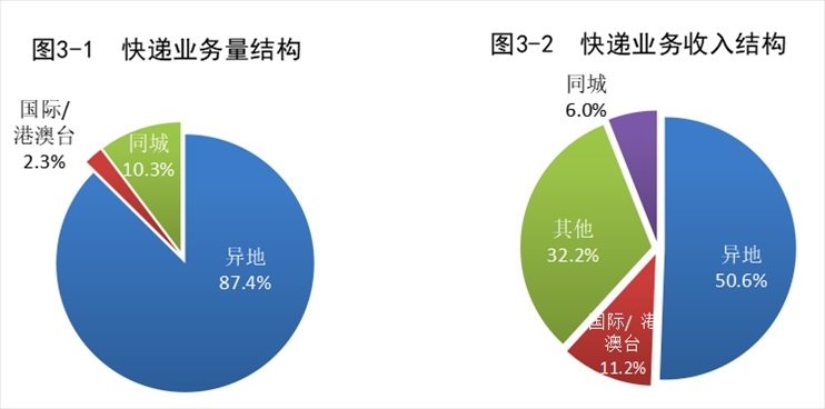 1-7月,郵政行業(yè)業(yè)務(wù)收入(不包括郵政儲蓄銀行直接營業(yè)收入)累計完成8482.3億元,同比增長10.5%。其中,快遞業(yè)務(wù)收入累計完成6495.3億元,同比增長10.5%。7月份,郵政行業(yè)寄遞業(yè)務(wù)量完成131.6億件,同比增長9.7%。其中,快遞業(yè)務(wù)量完成107.7億件,同比增長11.7%。7月份,郵政行業(yè)業(yè)務(wù)收入完成1194.5億元,同比增長5.3%。其中,快遞業(yè)務(wù)收入完成952.4億元,同比增長6.0%。1-7月,同城、異地、國際/港澳臺快遞業(yè)務(wù)量分別占全部快遞業(yè)務(wù)量的10.3%、87.4%和2.3%;業(yè)務(wù)收入分別占全部快遞收入的6.0%、50.6%和11.2%。與去年同期相比,同城快遞業(yè)務(wù)量的比重下降1.7個百分點,異地快遞業(yè)務(wù)量的比重上升1.1個百分點,國際/港澳臺業(yè)務(wù)量的比重上升0.6個百分點。