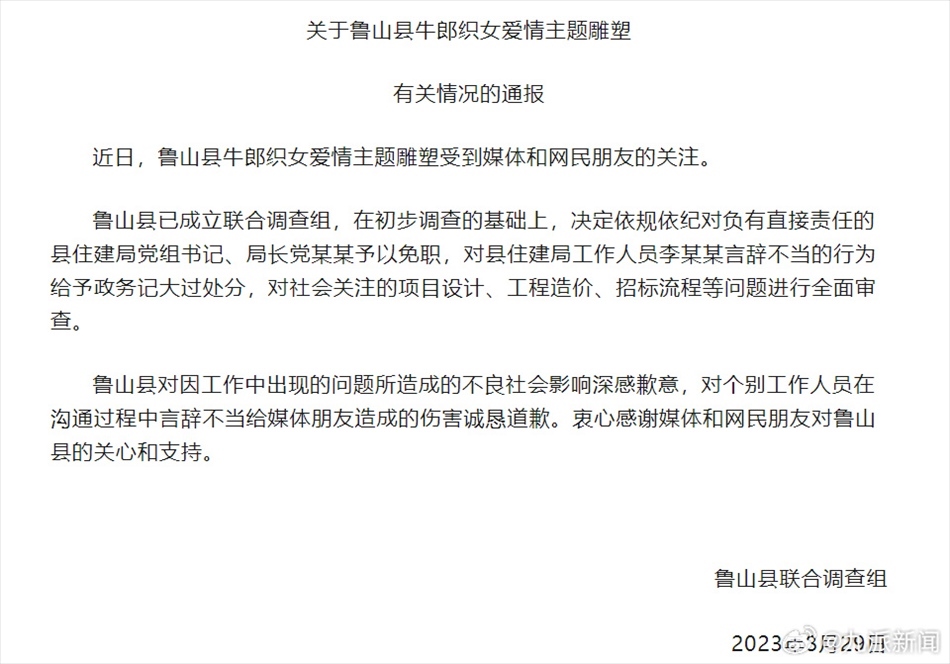 ·魯山縣通報花700多萬建牛郎織女雕塑:縣住建局局長免職,罵記者的工作人員記大過。