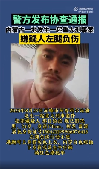 ·內蒙古赤峰市發(fā)生一起重大刑事案件,警方發(fā)布協(xié)查通報。