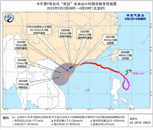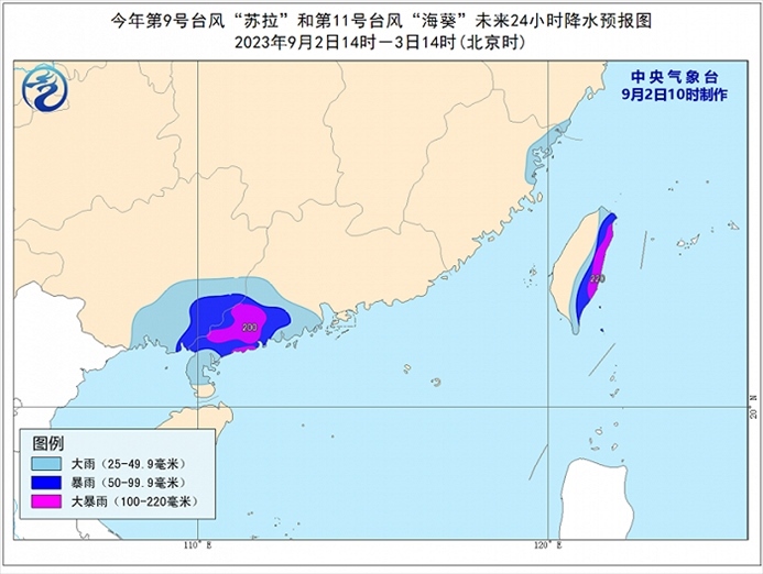 降水預(yù)報(bào):9月2日14時(shí)至3日14時(shí),受“蘇拉”和“??庇绊?,廣東西南部、廣西東南部、福建東北部沿海、臺(tái)灣島東部等地有大到暴雨,其中,廣東西南部、臺(tái)灣島東部等地部分地區(qū)有大暴雨(100~220毫米)。