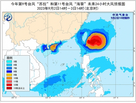 大風(fēng)預(yù)報(bào):9月2日14時(shí)至3日14時(shí),受“蘇拉”影響,南海西北部、北部灣東部、瓊州海峽及廣東中西部沿海、廣西南部沿海、海南北部沿海、珠江口以及香港和澳門(mén)等地將有6-8級(jí)、陣風(fēng)9-10級(jí)的大風(fēng),“蘇拉”中心經(jīng)過(guò)的附近海面或地區(qū)風(fēng)力有11-12級(jí)、陣風(fēng)13-14級(jí);受“海葵”影響,臺(tái)灣海峽、巴士海峽、浙江南部沿海、福建沿海、廣東東部沿海、臺(tái)灣島沿海將有6-8級(jí),陣風(fēng)9-10級(jí)大風(fēng),臺(tái)灣以東洋面部分海域風(fēng)力可達(dá)9-12級(jí),陣風(fēng)13-14級(jí),“??敝行慕?jīng)過(guò)的附近海面風(fēng)力可達(dá)13-16級(jí),陣風(fēng)17級(jí)及以上。