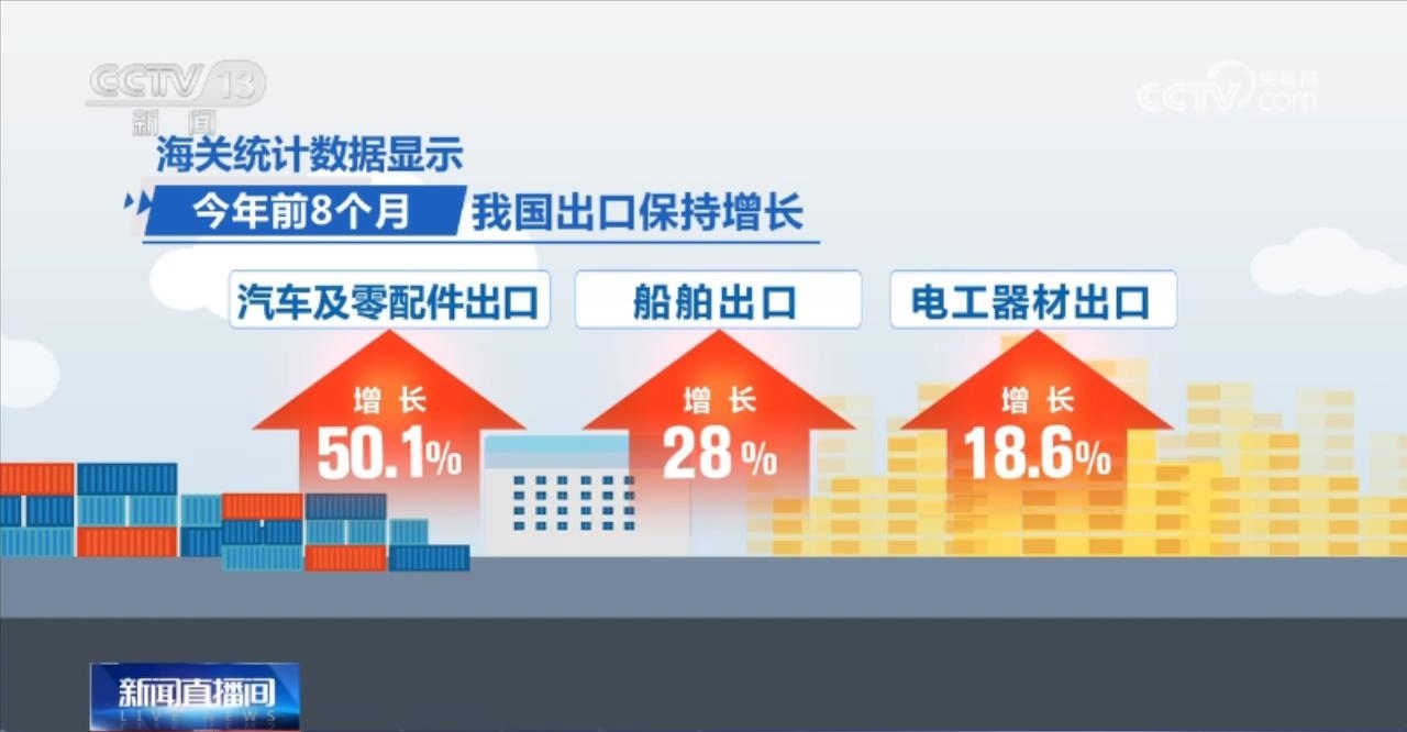 今年前8個(gè)月,我國(guó)出口保持增長(zhǎng)。其中,機(jī)電產(chǎn)品出口8.97萬億元,同比增長(zhǎng)3.6%,占同期我國(guó)出口總值的58%;汽車及零配件出口、船舶出口、電工器材出口分別增長(zhǎng)50.1%、28%、18.6%。