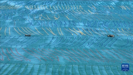 金秋時(shí)節(jié),在榮成市愛倫灣海洋牧場生態(tài)養(yǎng)殖區(qū),漁民駕駛漁船、舢板出海作業(yè)。