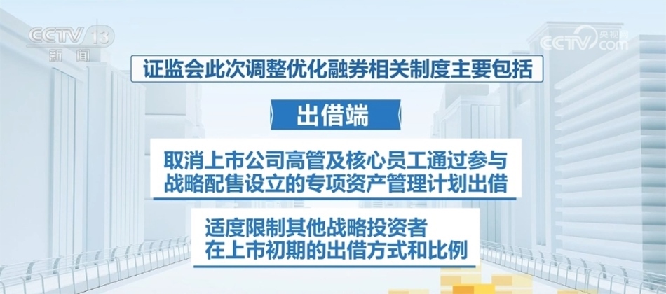 證監(jiān)會(huì)此次調(diào)整優(yōu)化融券相關(guān)制度主要包括:融券端,將融券保證金比例由不得低于50%上調(diào)至80%,對(duì)私募證券投資基金參與融券的保證金比例上調(diào)至100%;出借端,取消上市公司高管及核心員工通過參與戰(zhàn)略配售設(shè)立的專項(xiàng)資產(chǎn)管理計(jì)劃出借,適度限制其他戰(zhàn)略投資者在上市初期的出借方式和比例。