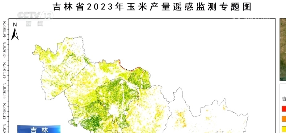 這張就是吉林省玉米產(chǎn)量的初步估產(chǎn)圖。作為本年度吉林省農(nóng)作物監(jiān)測(cè)的重要成果之一,它清晰地反映出玉米在吉林省的分布情況。