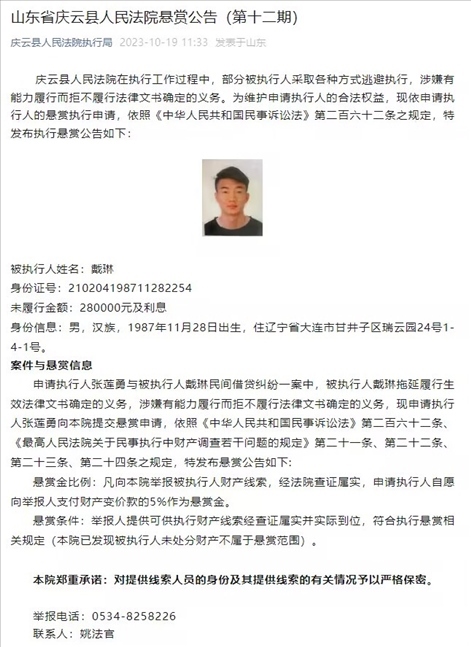 ·前國腳戴琳欠款28萬元,有能力而拒不履行被法院公開懸賞。