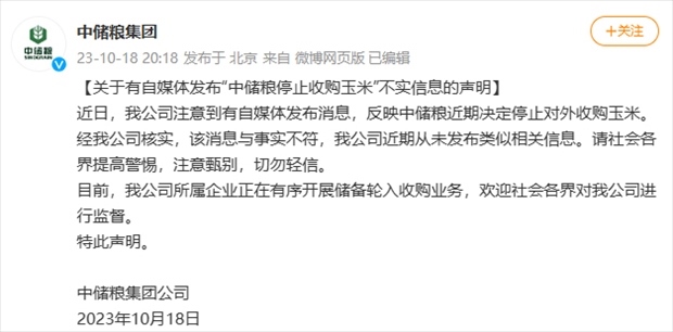 ·中儲(chǔ)糧集團(tuán)辟謠停止收購玉米:近期從未發(fā)布類似相關(guān)信息。