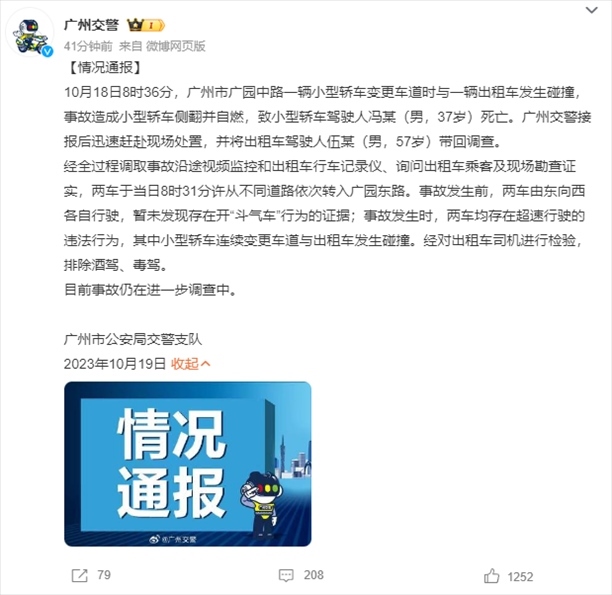 ·廣州交警通報(bào)寶馬車與出租車發(fā)生碰撞后撞上橋墩起火、駕駛?cè)怂劳鍪录簝绍嚲?、未發(fā)現(xiàn)開“斗氣車”。出租車所屬公司發(fā)聲:司機(jī)已盡力剎車,但確實(shí)存在超速。