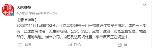 ·遼寧省沈陽市大東區(qū)遼沈二街59號(hào)三門一推拿理療店發(fā)生爆燃,店內(nèi)一人受傷。