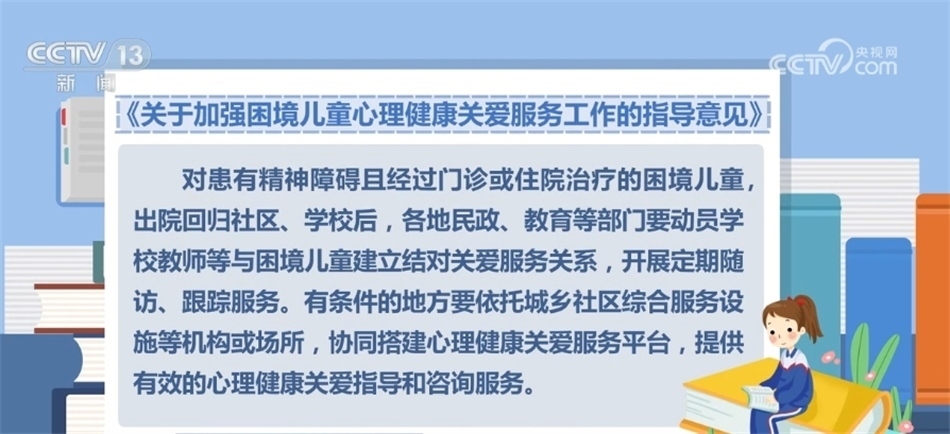 央視網(wǎng)消息:近日,民政部等五部門聯(lián)合印發(fā)《關(guān)于加強(qiáng)困境兒童心理健康關(guān)愛(ài)服務(wù)工作的指導(dǎo)意見(jiàn)》,通過(guò)加強(qiáng)心理健康教育、開展心理健康監(jiān)測(cè)等措施,全面提升困境兒童心理健康水平和身心健康素質(zhì)。