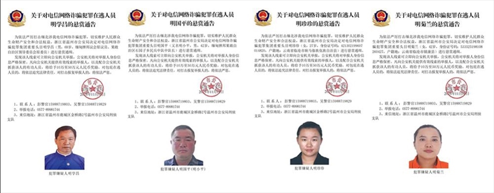 ·公安機關公開通緝緬北果敢自治區(qū)電信網(wǎng)絡詐騙犯罪集團重要頭目明學昌、明國平、明菊蘭、明珍珍。