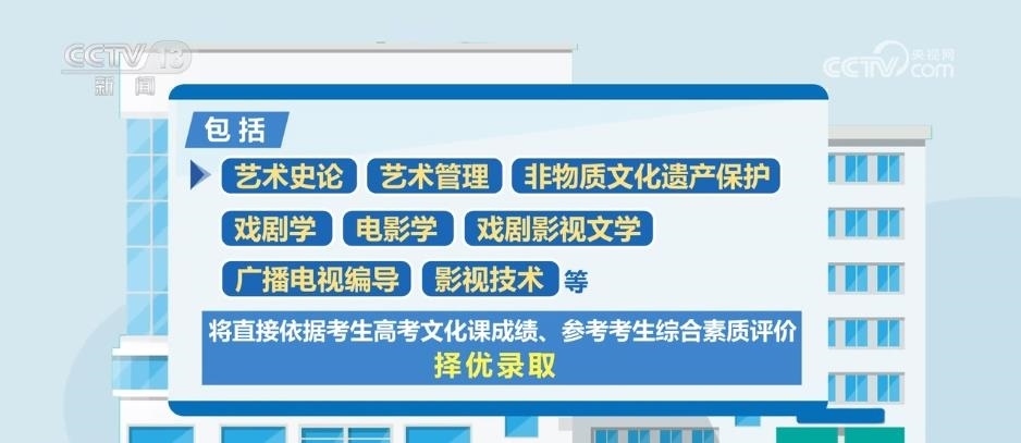 據(jù)了解,藝術(shù)類專業(yè)依據(jù)考生高考文化成績、專業(yè)考試成績,參考綜合素質(zhì)評價進(jìn)行招生錄取。此次藝考改革一個重要的變化是,部分藝術(shù)類專業(yè)不再組織專業(yè)考試,包括藝術(shù)史論、藝術(shù)管理、非物質(zhì)文化遺產(chǎn)保護(hù)、戲劇學(xué)、電影學(xué)、戲劇影視文學(xué)、廣播電視編導(dǎo)、影視技術(shù)等,將直接依據(jù)考生高考文化課成績、參考考生綜合素質(zhì)評價,擇優(yōu)錄取。