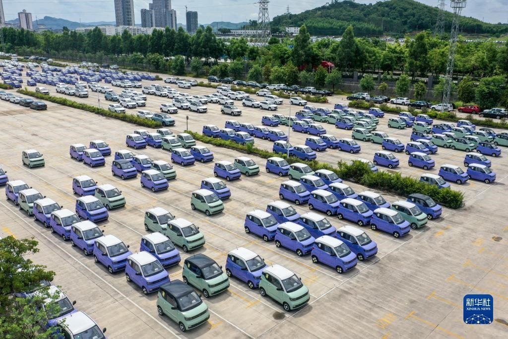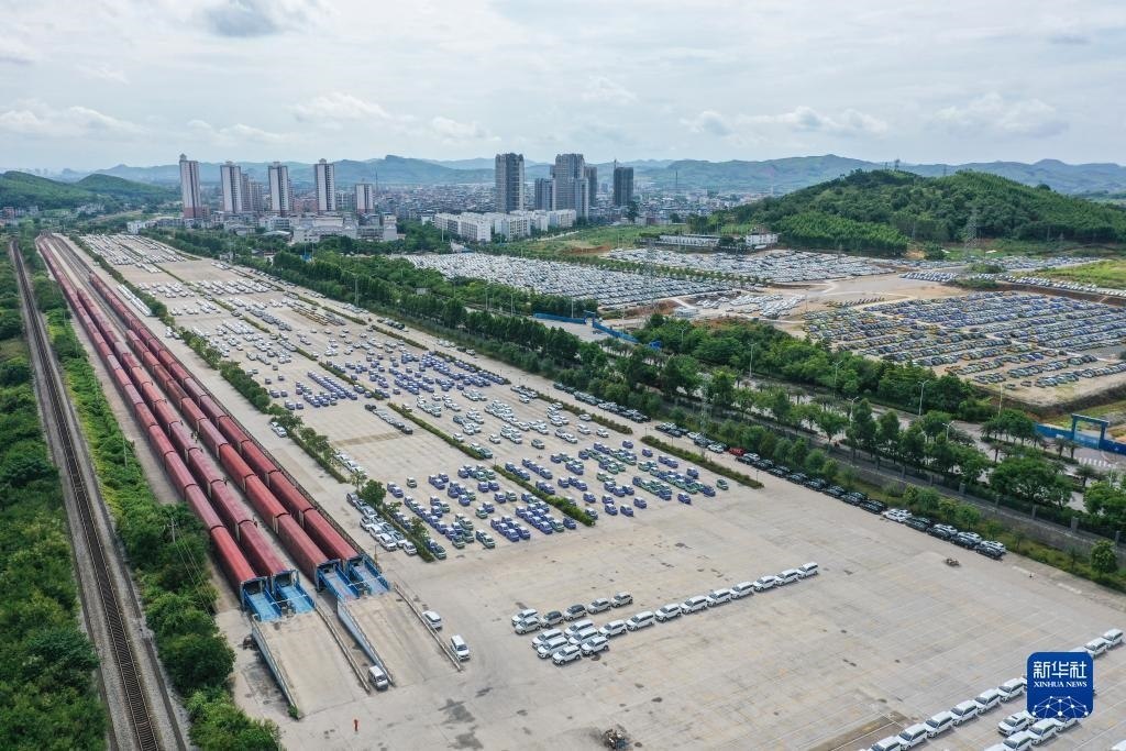 這是位于廣西柳州市的雒容汽車物流基地,一些出口的新能源汽車從這里裝車運(yùn)往各大出海港口(7月19日攝,無(wú)人機(jī)照片)。新華社記者 曹祎銘 攝
