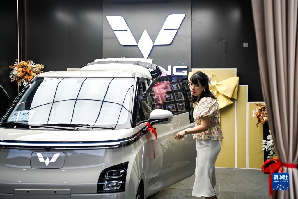 10月1日,在印度尼西亞雅加達(dá)一家商場(chǎng),人們?cè)隗w驗(yàn)一輛五菱新能源車Air ev(手機(jī)照片)。新華社記者 徐欽 攝