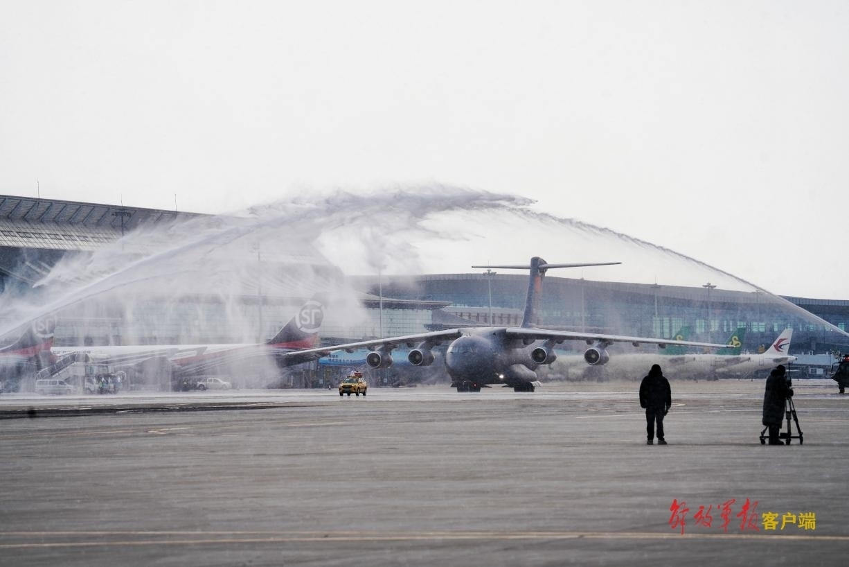 滑行時(shí),兩道水柱從跑道兩側(cè)的消防車(chē)中噴射而出,它們?cè)趻佄锞€(xiàn)最高點(diǎn)相遇,一道“水門(mén)”傾瀉而下,為搭載志愿軍烈士遺骸的運(yùn)-20專(zhuān)機(jī)接風(fēng)洗塵。