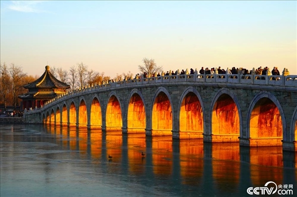 2023年12月3日,北京頤和園,落日余暉穿過十七孔橋的孔洞,形成“金光穿洞”美景。