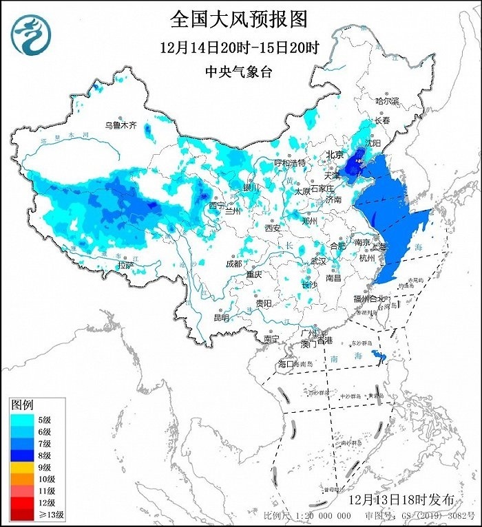 12月14日20時(shí)至15日20時(shí),內(nèi)蒙古中西部、寧夏、西藏西部、青海東部和南部等地部分地區(qū)有5~6級(jí)、陣風(fēng)7~9級(jí)的大風(fēng);渤海、渤海海峽、黃海大部海域、東海西部海域?qū)⒂?~8級(jí)、陣風(fēng)9級(jí)的大風(fēng),其中渤海東北部的部分海域風(fēng)力可達(dá)9級(jí)、陣風(fēng)10級(jí)。