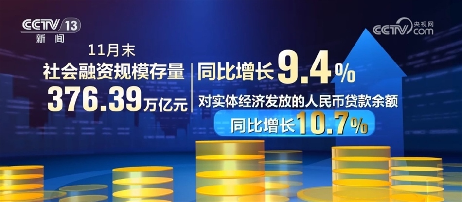 11月末社會融資規(guī)模存量為376.39萬億元,同比增長9.4%。其中,對實(shí)體經(jīng)濟(jì)發(fā)放的人民幣貸款余額同比增長10.7%。11月份社會融資規(guī)模增量為2.45萬億元,比上年同期多4556億元。