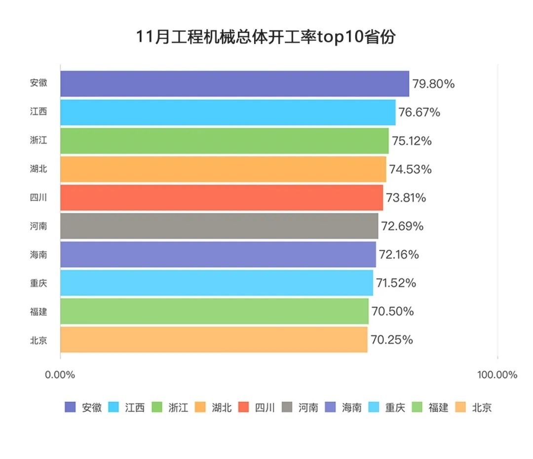 11月,安徽、河南、湖北各有7類設(shè)備平均作業(yè)量同比增長,江西有3類設(shè)備平均作業(yè)量同比增長,主要集中在汽車起重機(jī)、履帶起重機(jī)、挖掘機(jī)。
