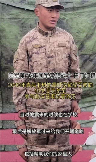 巴丁江措,第76集團軍某旅戰(zhàn)士。2010年青海玉樹地震時,解放軍幫他脫險。如今,同樣成為解放軍的他奮戰(zhàn)在甘肅抗震救災(zāi)一線。他說:“我想對以前救我的人說,我?guī)椭烁嗳?,讓他們?yōu)槲因湴?!?/p>