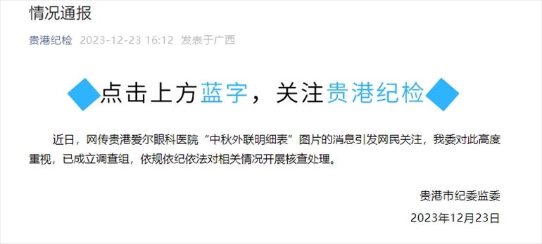 ·貴港市紀(jì)委通報“網(wǎng)傳愛爾眼科中秋外聯(lián)明細(xì)表”:已成立調(diào)查組,對相關(guān)情況開展核查處理。據(jù)早前報道,網(wǎng)友爆料發(fā)布了兩張標(biāo)為“中秋外聯(lián)明細(xì)表”的圖片,其中涉及42名公職人員以及59000元額度的購物卡,并在評論中透露上述圖片的涉事單位為貴港愛爾眼科醫(yī)院。