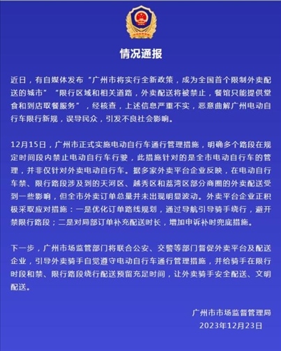 ·網(wǎng)傳廣州限制外賣配送?廣州市市場監(jiān)督管理局:嚴(yán)重不實。