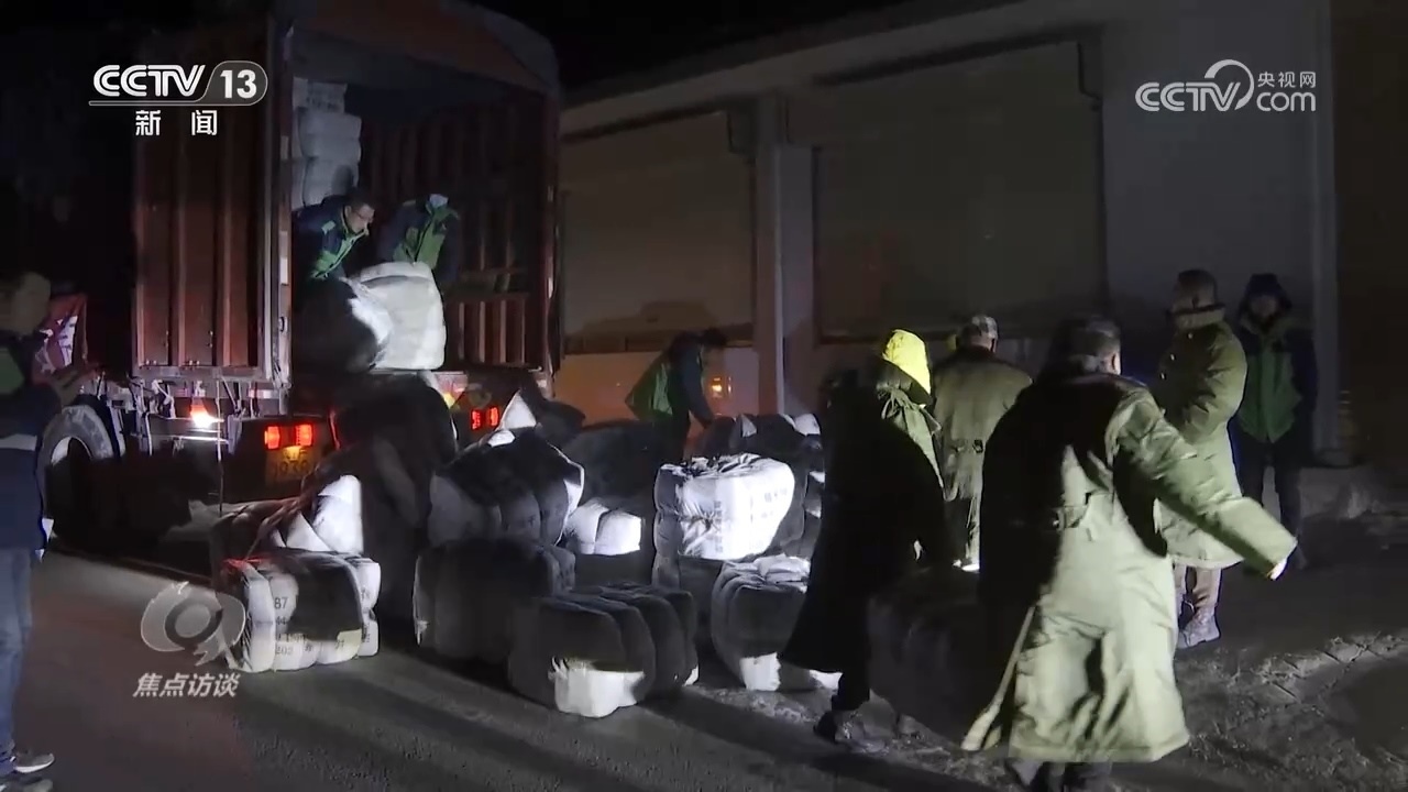 為了盡快給村民送去保障物資,刁四村村民的車隊日夜兼程。22日凌晨,歷經32個小時,帶著全村2000多人的囑托,這個車隊跨越1600公里,終于抵達了積石山縣的安集鎮(zhèn)。顧不上休息,刁四村的村民就和當?shù)卮迕褚黄鸢沿浳镄读讼聛怼N遘囄镔Y,足足卸了三個小時,其中包括2400件軍大衣、2580件棉被、1820副自發(fā)熱鞋墊。