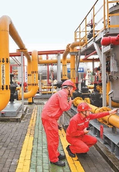 在位于重慶涪陵的中國(guó)首個(gè)投入商業(yè)開發(fā)頁巖氣田——涪陵頁巖氣田白濤集輸站,技術(shù)人員對(duì)設(shè)備進(jìn)行巡檢。新華社記者 王全超攝