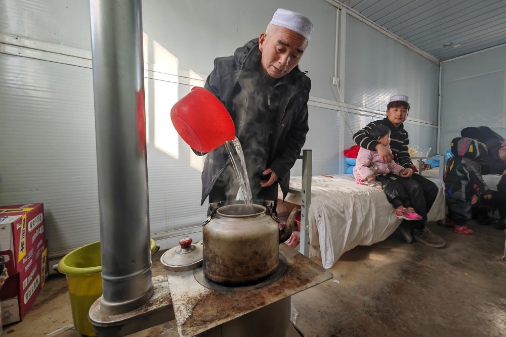 在甘肅臨夏積石山縣大河家鎮(zhèn)梅坡村活動板房安置點(diǎn),受災(zāi)村民在活動板房內(nèi)的火爐上燒水(12月21日攝)。新華社記者 范培珅 攝
