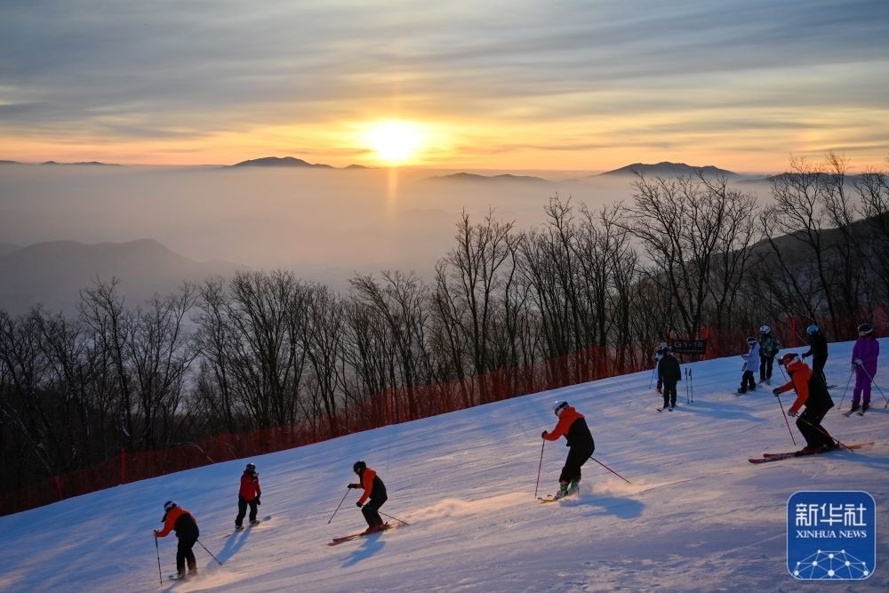 1月1日,在吉林省吉林市萬科松花湖度假區(qū),滑雪愛好者在晨光下滑雪。新華社記者 顏麟蘊 攝